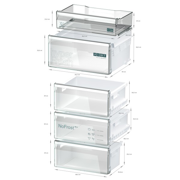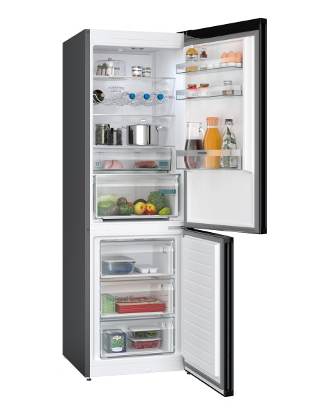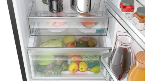 IQ300, Combinado twin noFrost full skin condenser, Sistema multiAirflow (white glossy), Portas blackInox, 186 x 60 x 66,5 cm, 321 (218 + 103) litros, B, 33 dB, SN-T, 2 circuitos de frio independentes, 1 gaveta hyperFresh, 1 gaveta hyperFresh 0ºC, Visor Led, Super refrigeração, Super congelação, Iluminação LED com softStart, Alarme sonoro e visual de porta frigorÃfico aberta , Suporte cromado para garrafas, Puxadores verticais integrados