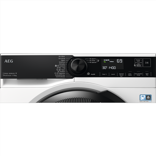 Funções: Ligar Desligar, Temperatura, Centrifugação, Pré lavagem nódoas, Time Save, Enxaguamento extra, Vapor Plus, Início remoto, Termina em , Início Pausa