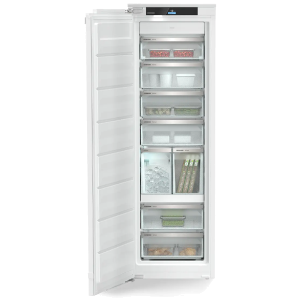 LIEBHERRArca Vertical Encastre LIEBHERR - SIFNdi 5188Arca Vertical Encastre  LIEBHERR - SIFNdi 5188Classe de eficiência energética: D | Consumo de energia ano / 24 h: 190 / 0,520 kWh | Capacidade útil total : 213 l | Nível de ruído / Classe de emissão de ruído: 33 dB(A) / B, SuperSilent | Classe climática: SN-T (entre +10 °C to +43 °C) | Dimensões de abertura em cm (A / L / P) 177,2-178,8 / 56-57 / min. 55 | TFT 2,4" - ecrã a cores - Tecnologia Touch & Swipe | Ecrã digital de temperatura | SmartDeviceBox incluída | Sinal de aviso em caso de anomalia: visual e acústico | Alarme de porta: visual e acústico | Painel de aquecimento lateral em ambos lados, adequados à combinação com outros frigoríficos, congeladores e/ou garrafeiras | Pés ajustáveis à frente | Dobradiça de porta reversível, esquerda | Borracha substituível | | COMPARTIMENTO CONGELADOR | 8 gavetas, das quais 5 em calhas telescópicas, VarioSpace | IceTower | IceMaker com ligação de 3/4" à rede de água, Iluminação LED | Produção de gelo em 24 h: 0,8 kg | Reservatório de cubos de gelo: 5,7 kg | Iluminação LED | Armazenamento em caso de avaria: 9 hr | Capacidade de congelação em 24h: 12 kg | 2 acumuladores de frio | Acessórios em vidro de segurança > arcas295790NovoProduto disponível