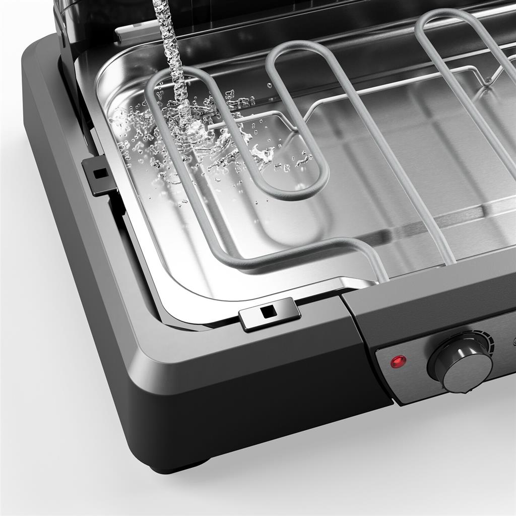 A churrasqueira elétrica Princess possui uma bandeja de gordura que você enche com água antes de começar a grelhar, o que garante que haja pouca ou nenhuma fumaça. Os sucos e gorduras caem no banho-maria e esfriam instantaneamente para que você não receba nenhuma fumaça prejudicial à saúde ou partículas de cinzas na comida. O fato da churrasqueira elétrica gerar menos fumaça torna a churrasqueira perfeita para acampar.