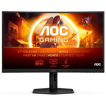 AOC G4 CQ27G4X. Tamanho do ecrã na diagonal: 68,6 cm (27"), Resolução: 2560 x 1440 pixels, Tipo de HD: Quad HD, Tecnologia de apresentação: LCD, Tempo de resposta: 0,5 ms, Proporção de imagem nativa: 16:9, Ângulo de visão (horizontal): 178°, Ângulo de visão (vertical): 178°. Ajuste de altura. Cor do produto: Preto