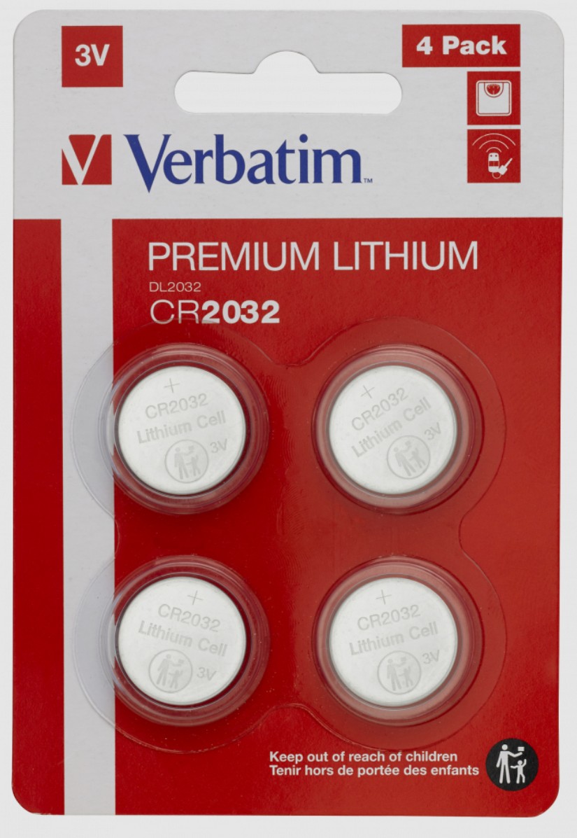 VERBATIMCR2032 3V Bateria de lítio (pacote com 4) VERBATIMCR2032 3V Bateria de lítio (pacote com 4) VERBATIMBaterias de lítio premium CR2032 tipo moeda Para dispositivos eletrônicos menores, como balanças digitais, chaves de carro com controle remoto e calculadoras. Pacote com 4 unidades > baterias / pilhas090NovoProduto disponível