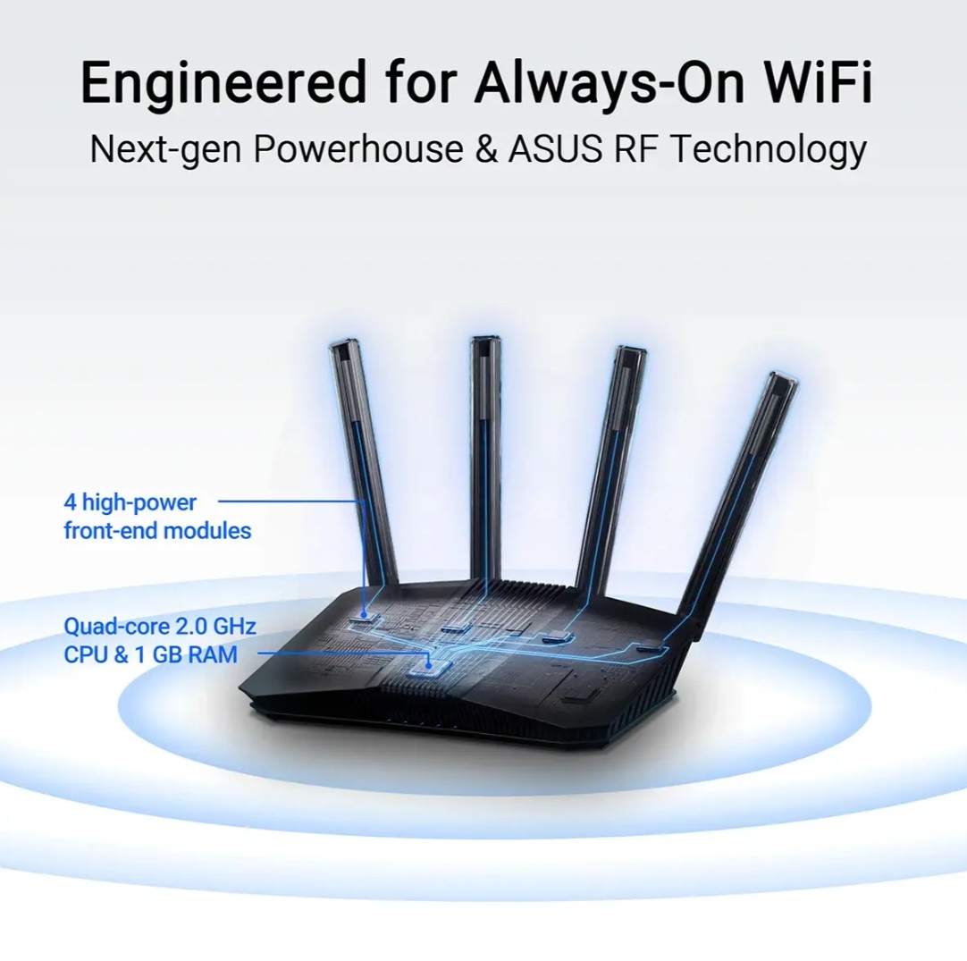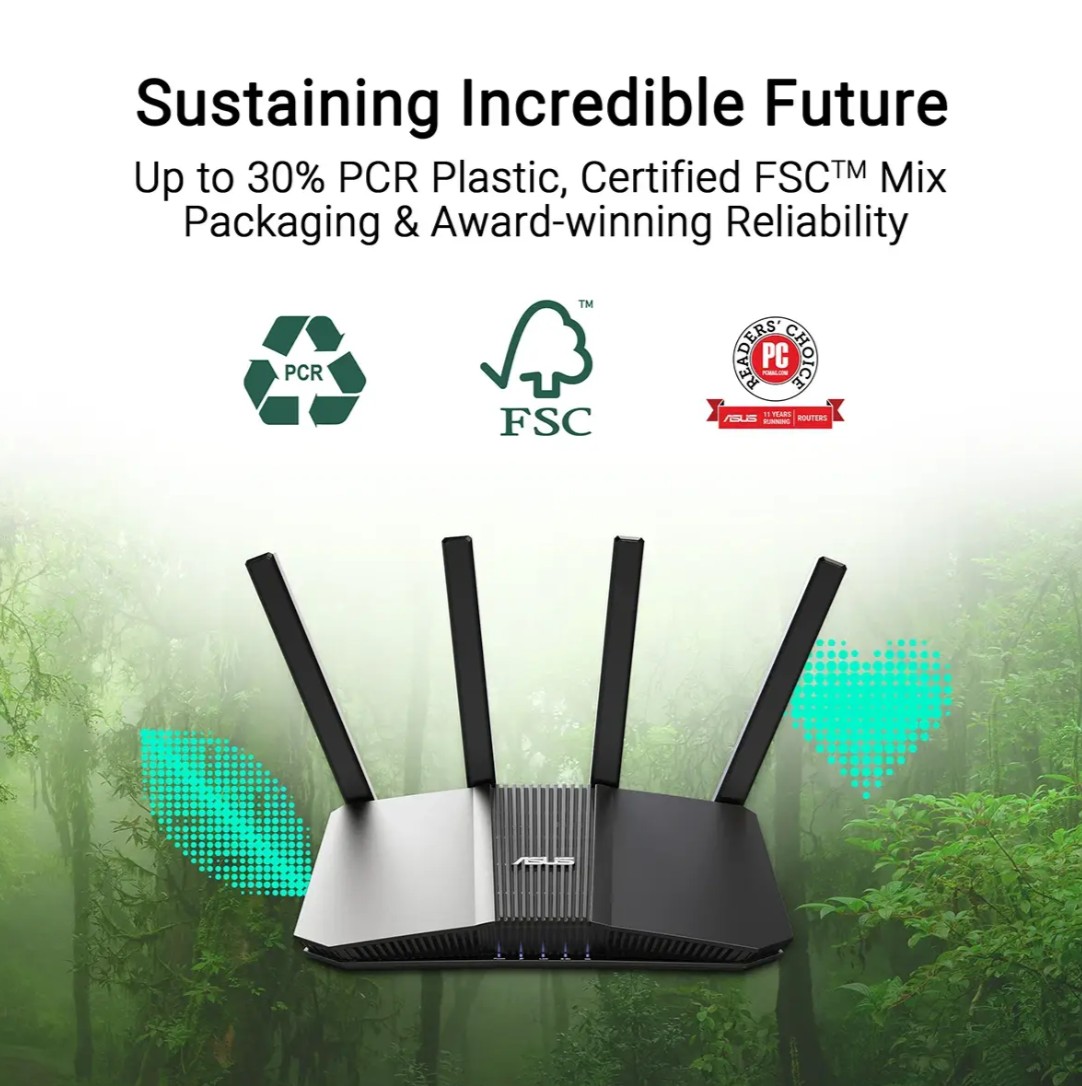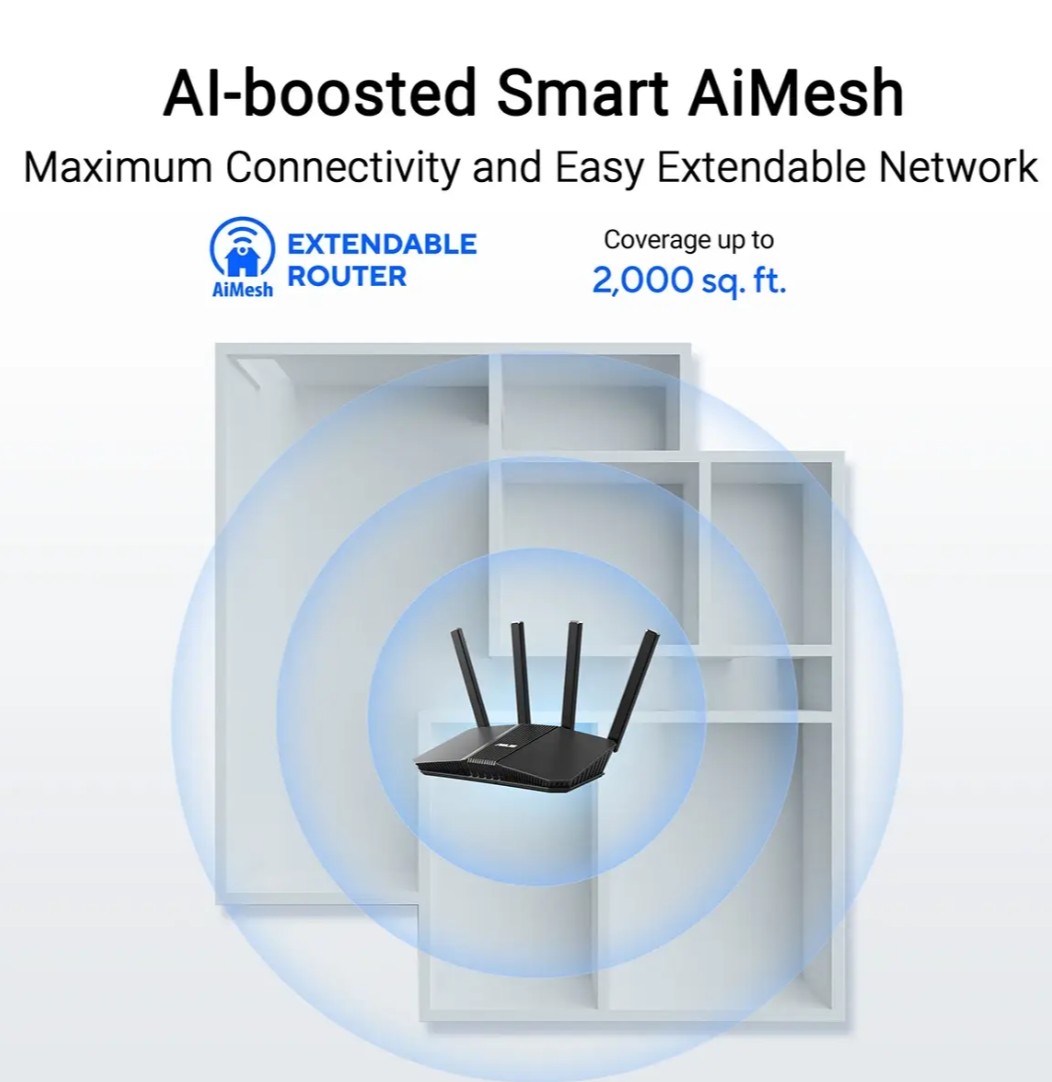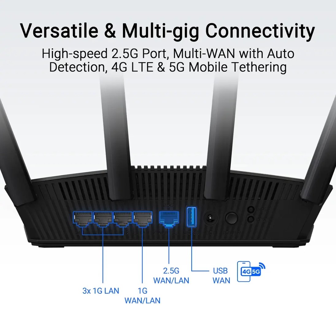 Eleva a tua casa inteligente com velocidades WiFi 7 Tri-band extremamente rápidas de até 9700 Mbps, alcance melhorado com a tecnologia RF da ASUS e Smart AiMesh com IA e até 20G de capacidade com fios. O ASUSRT-BE58U liberta o WiFi de 6 GHz superior e a rede 10G preparada para o futuro. Com a nova suite ASUS Network Security e funcionalidades avançadas como a IoT Network, oRT-BE58U protege a tua rede de ponta a ponta, 24/7.0