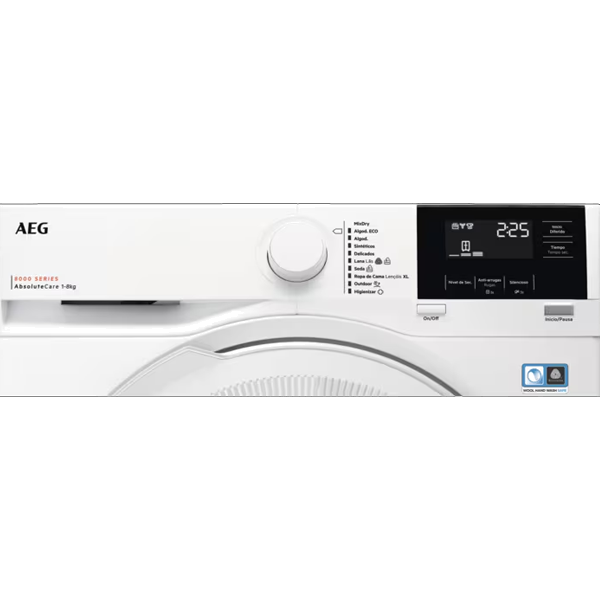 AEGMáquina de Secar Roupa AEG TR818A2OB Bomba de calor 8Kg Classe CMáquina de Secar Roupa AEG TR818A2OB Bomba de calor 8Kg Classe CCapacidade de secagem: 8 kg | Tecnologia com bomba de calor | Painel com o texto em | Sensor de secagem: O controlo electrónico deste secador mede a humidade do tecido e termina o programa quando o nível de humidade corresponde ao que foi definido por si. | Programas adicionais de secagem por tempo | Programas especiais: | Programas de secagem por tempo: min. | Consumo de energia (programa secagem algodão para arrumar): só 1.250 (1.490) kWh após secagem à velocidade de centrifugação de 1400 (1000) rpm | Display LCD médio | Início diferido | Indicadores LED das fases do programa | Indicadores luminosos: Filtro, Depósito, Condensador obstruído | Posição do depósito de condensação e capacidade: Panel left recycled, 5.32 l | Pés ajustáveis | Altura, mm: 850 | Largura, mm: 596 | Profundidade, mm: 638 | Profundidade total, mm: 663 | Voltagem, V: 230 | Consumo de energia para 100 ciclos do programa Eco (UE 2017/1369): 97 | Emissão de ruído aéreo (UE 2017/1369): 67 | Classe de emissão de ruído (UE 2017/1369): C | Capacidade de secagem em kg: 8.0 | O consumo de energia do programa eco em kWH por ciclo (UE 2017/1369): 0.97 | Classe de eficiência energética (Regulamento (UE) 2017/1369): C | Classe energética comercial: C | Índice de eficiência energética (UE 2017/1369): 57.1 | Consumo de energia em modo stand-by (UE 2017/1369): 0.05 | Consumo de energia em modo desligado (UE 2017/1369): 0.05 | Frequência, Hz: 50 | Lista de programas: MixDry, Eco, Algodões, Sintéticos, Delicados, Lãs, Sedas, Roupa de cama XL, Desporto, Hygiene | Outros indicadores: Filtro, Depósito, Condensador obstruído | Funções: Ligar/Desligar, Início/Pausa, Silencioso, Início diferido, Secagem, Tempo de secagem, Antirrugas > secar64190NovoProduto disponível