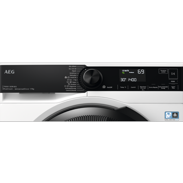 Funções: Ligar/Desligar, Temperatura, Centrifugação, Pré lavagem / nódoas, Time Save, Enxaguamento extra, Vapor Plus, Termina em , Pods, Início/Pausa |