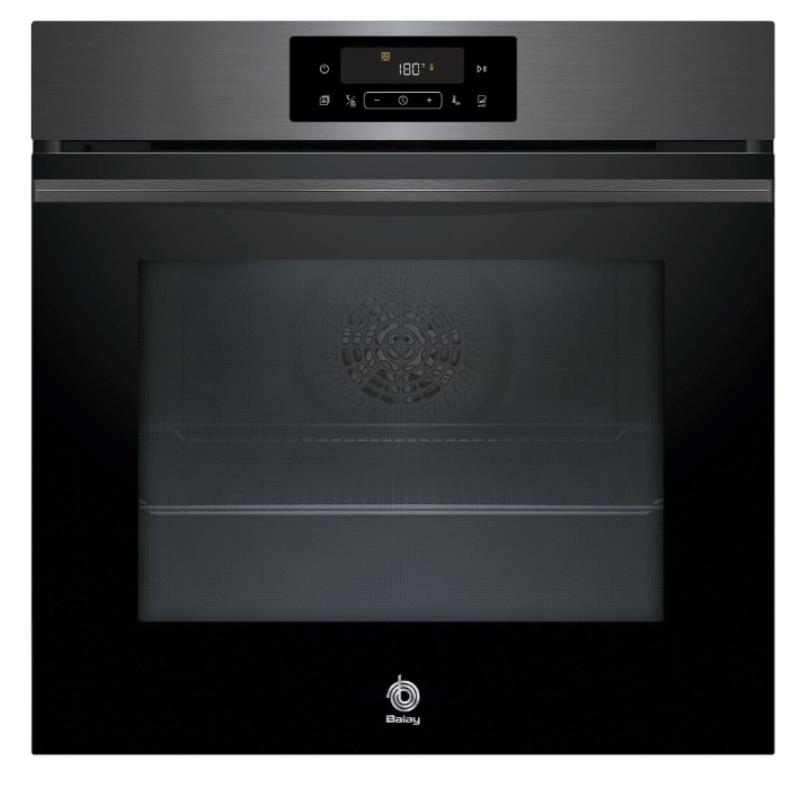Forno multifunções com Função Air Fry (tabuleiro incluÃdo), 60 cm, cinza grafite (painel puxador) & preto (porta), 71 litros, A+, controlo tátil com visor LED âmbar e branco, 7 modos de aquecimento, Auto Chef c 10 receitas (programas automáticos), limpeza pirolÃtica & assistente de limpeza, calha telescópica fixa com 1 nÃvel, abertura fecho suave da porta, porta com 4 vidros, relógio eletrónico (horas, alarme, programação de inÃcio e fim de cozedura)