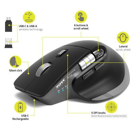 PORTRato sem fio e Bluetooth recarregável ULTIMATE - 910203Rato sem fio e Bluetooth recarregável ULTIMATE - 910203Mouse profissional multiúso: Projetado para usuários exigentes, o mouse ULTIMATE oferece conectividade dupla via tecnologia sem fio 2.4 GHz e Bluetooth®. Você pode facilmente alternar entre três dispositivos diferentes: um através da conexão 2.4 GHz e dois outros via Bluetooth®. É a ferramenta ideal para otimizar sua produtividade no escritório ou em movimento, com uma transição suave entre seus diferentes dispositivos. Carga rápida e gestão de energia inteligente: Equipado com uma bateria recarregável integrada via USB-C, o rato ULTIMATE liberta-o das limitações das baterias convencionais. Isso permite que você aproveite o alcance estendido e carregamento rápido, enquanto economiza energia com um modo de espera automático e um botão ON/OFF para prolongar a vida útil da bateria. Rolagem ultra precisa e navegação lateral intuitiva: O ULTIMATE A roda do mouse FreeWheel® permite uma rolagem excepcionalmente rápida e precisa, perfeita para navegar documentos longos ou páginas da web. Além disso, a roda lateral oferece navegação intuitiva da esquerda para a direita, ideal para grandes planilhas e apresentações complexas. Trabalhe com fluidez e precisão, qualquer que seja suas tarefas. Desempenho silencioso e configurações personalizadas: Para um ambiente de trabalho tranquilo e agradável, o mouse ULTIMATE está equipado com cliques tranquilos, perfeito para espaços compartilhados. Seu sensor óptico oferece uma velocidade ajustável entre 800 e 4000 DPI, permitindo que você ajuste a precisão de seus movimentos de acordo com suas necessidades. Com seis botões personalizáveis, incluindo um dedicado à seleção de conexão sem fio, este mouse é um aliado poderoso e confiável. garantia de 3 anos para garantir a paz de espírito a longo prazo. O mouse sem fio recarregável ULTIMATE & Bluetooth combina desempenho, versatilidade e conforto para atender às necessidades de profissionais exigentes. Com seus recursos avançados, gerenciamento de energia inteligente e design ergonômico, é a ferramenta ideal para melhorar sua produtividade diária. EAN; 3567049102036 > ratos4890NovoProduto disponível