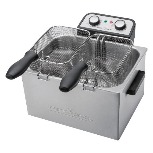 A Fritadeira Proficook FR 1038, semi-profissional, apresenta um robusto design. Equipada com dois cestos pequenos para usar em diferentes tipos de ingredientes ou um grande para fazer tudo de uma só vez, adaptável consoante a sua necessidade, em Inox, garantindo maior resistência, higiene e durabilidade. Conta com capacidade até 5L de óleo e 3000Watts de potência, para que faça de forma prática e rápida, deliciosos fritos.