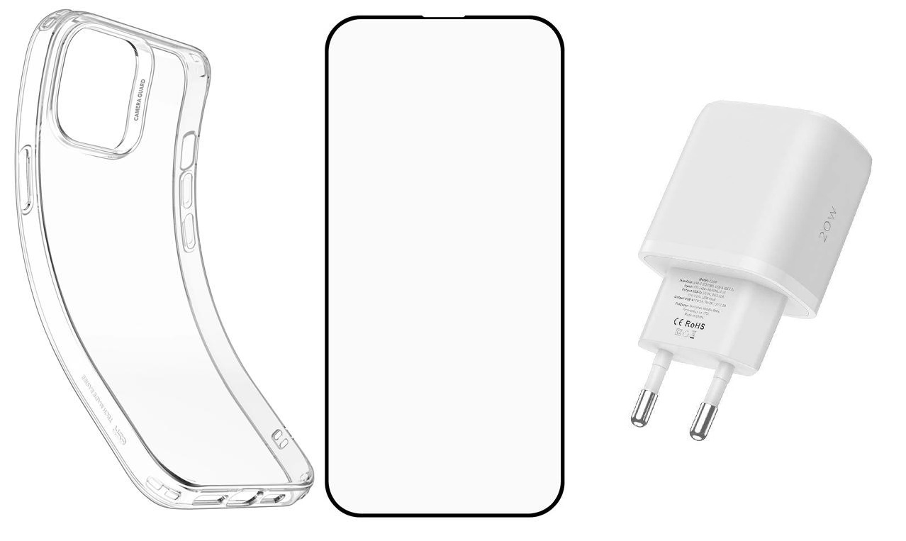 Pack Capa Transparente+Carregador+Película Carregador 20W Dual Port USB-A & USB-C