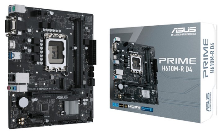 ASUS PRIME H610M-R D4. Fabricante do processador: Intel, Socket do processador: LGA 1700, Processador: Intel® Celeron®, Intel® Core™ i3, Intel® Core™ i5, Intel® Core™ i7, Intel® Core™ i9, Intel Pentium G. Tipos de memórias compatíveis: DDR4-SDRAM, Memória interna máxima: 64 GB, Tipo de ranhuras de memória: DIMM. Interfaces de armazenamento suportadas: M.2,SATA III, Tipos de unidade de armazenamento suportados: HDD & SSD. Resolução Máxima: 3840 x 2160 pixels. Tipo de conetor USB: USB Type-A