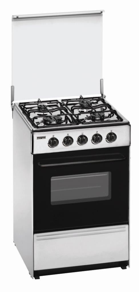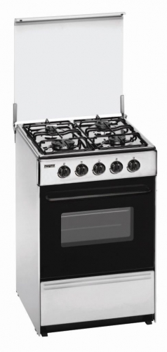 Mesa de trabalho: Aço inoxidável 4 queimadores a gás de alta eficiência Válvulas de segurança 2 grelhas esmaltadas Forno: Forno a gás Volume útil 55L Válvula de segurança Grelha e tabuleiro de recolha de molhos Porta amovível com vidro duplo Dimensões: A 86.5x L50x P55cm