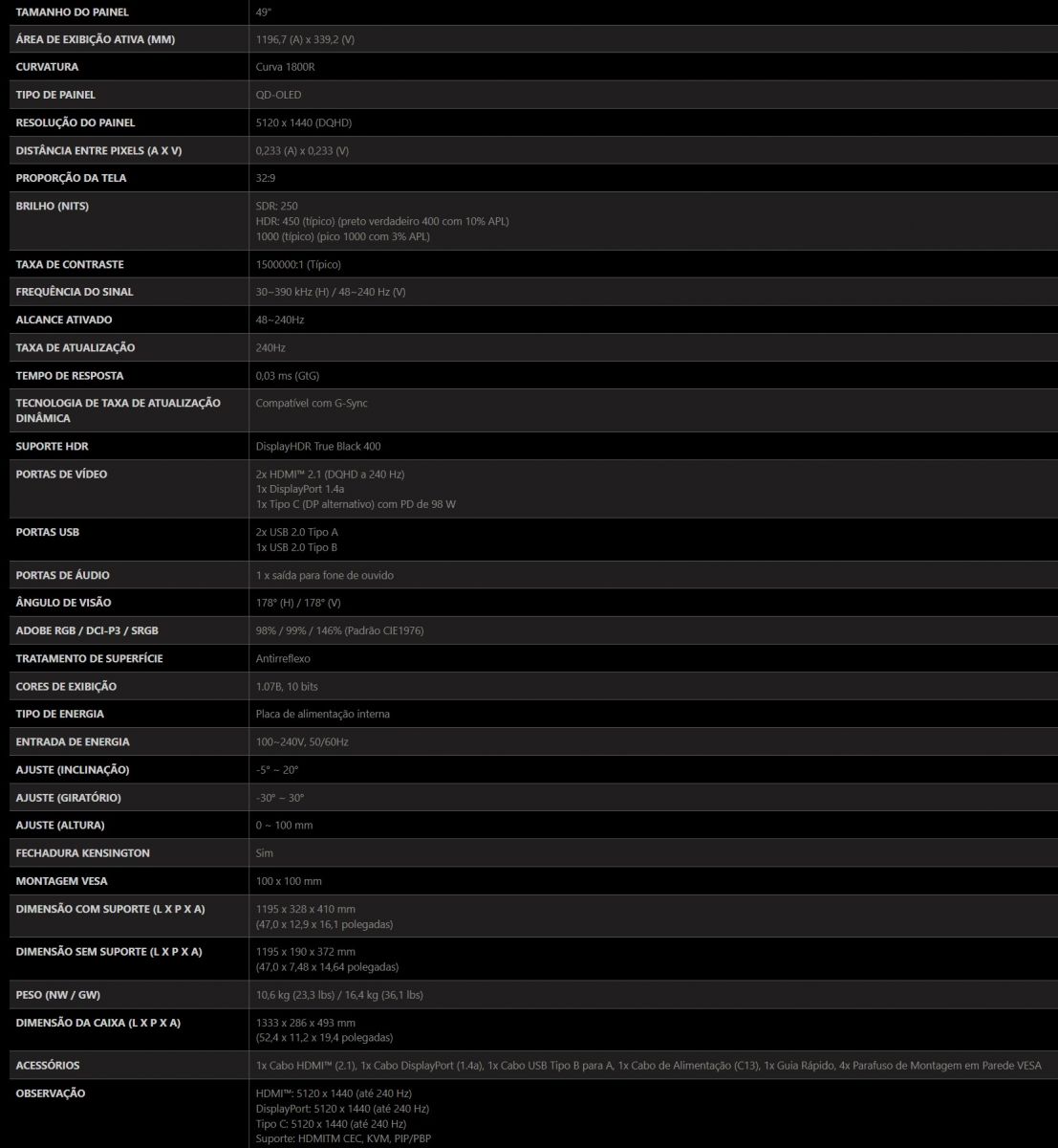 Monitor Profissional ASUS PG49WCD 49 quot Curvo DQHD 0 03ms 32 9 144hz HDMI Preto