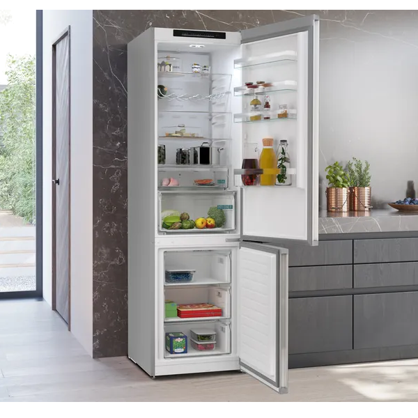 IQ300, Combinado Solo twin noFrost full skin condenser, Sistema multiAirflow (white glossy), Portas em aço antidedadas, 203 x 60 x 66,5 cm, 363 (260 + 103) litros, A, 112 kWh, 29 dB, SN-T, 2 circuitos de frio independentes, 1 gaveta hyperFresh, 1 gaveta hyperFresh 0ºC, Visor Led, Super refrigeração, Super congelação, Iluminação LED com softStart, Alarme sonoro e visual de porta frigorÃfico aberta, Suporte cromado para garrafas, Puxadores verticais integrados > combinado122290NovoProduto disponível€ 1222.90