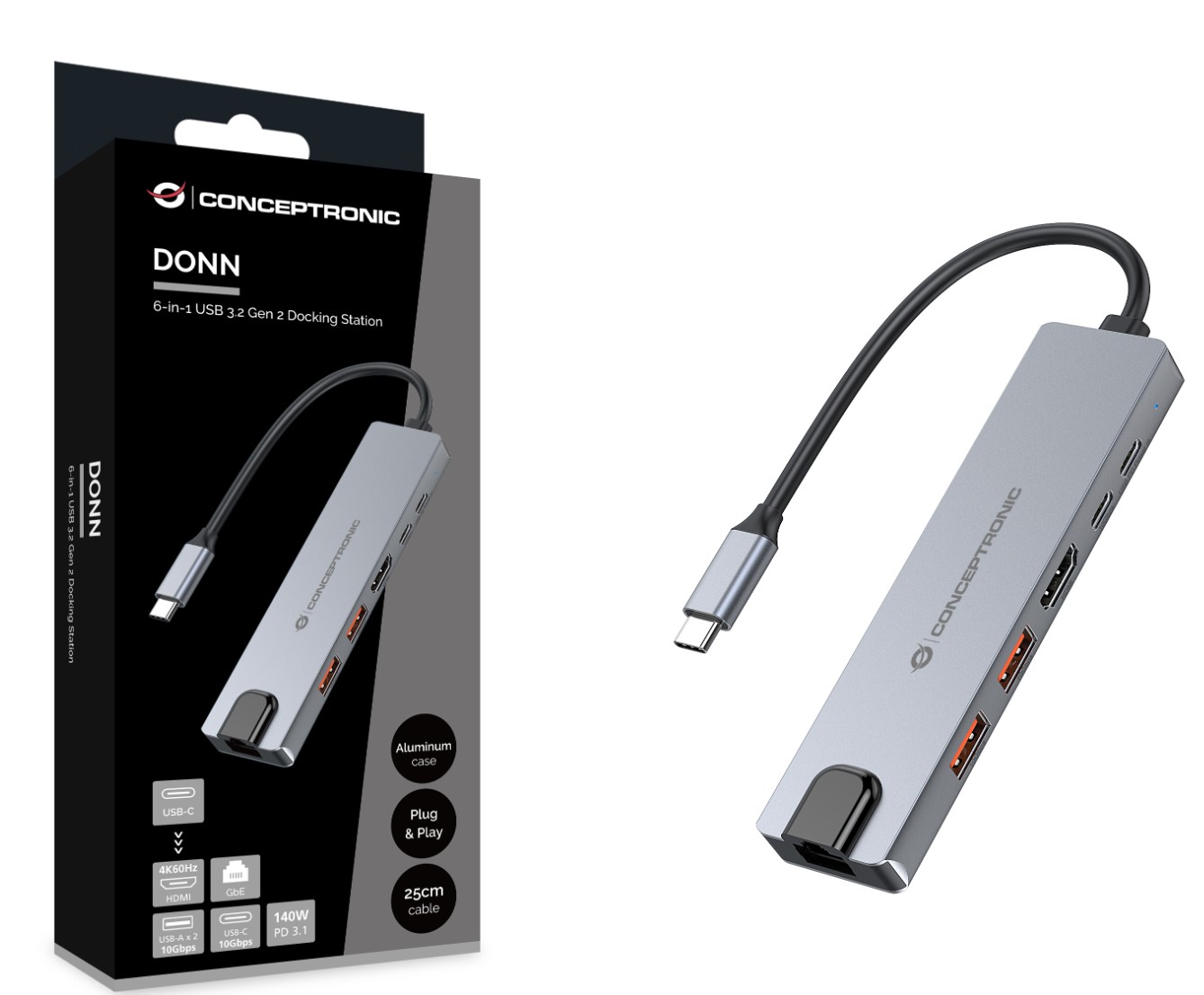 Conceptronic DONN29G. Tecnologia de conetividade: Com fios, Interface do host: USB 3.2 Gen 2 (3.1 Gen 2) Type-C, Fornecimento de energia USB até: 140 W. Taxa de transferência de dados Ethernet LAN: 10,100,1000 Mbit/s, Normas de Comunicações: IEEE 802.3ab. Cor do produto: Cinzento, Taxa de transferência de dados: 10 Gbit/s, Material do corpo do produto: Alumínio. Tipo de fonte de alimentação: USB, Comprimento de cabo USB: 0,25 m. Sistema operativo Windows compatível: Windows 10, Windows 10 Education, Windows 10 Education x64, Windows 10 Enterprise, Windows 10..., Sistema operativo Mac compatível: Mac OS X 10.10 Yosemite, Mac OS X 10.11 El Capitan, Mac OS X 10.12 Sierra, Mac OS X 10.13 High..., Sistemas operativos móveis compatíveis: Android 10.0, Android 11.0, Android 12.0, Android 13.0, Android 14.0, Android 5.0, Android 5.1,...