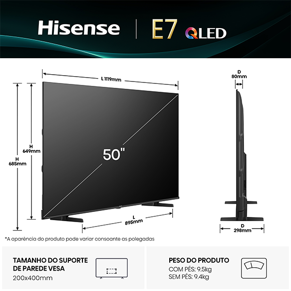 Com IVAHisense 50E7Q. Tamanho do ecrã na diagonal: 126 cm (50"), Resolução: 3840 x 2160 pixels, Tipo de HD: 4K Ultra HD, Tecnologia de apresentação: QLED, Formato do ecrã: Plano, Tipo de retroiluminação LED: Direct-LED. Smart TV. Luminosidade: 330 cd m², Tempo de resposta: 8 ms, Rácio de contraste (típico): 4000:1, Proporção de imagem nativa: 16:9. Sistema de formato de sinal digital: DVB-C, DVB-S, DVB-S2, DVB-T, DVB-T2. Wi-Fi, Ethernet LAN. Cor do produto: Preto