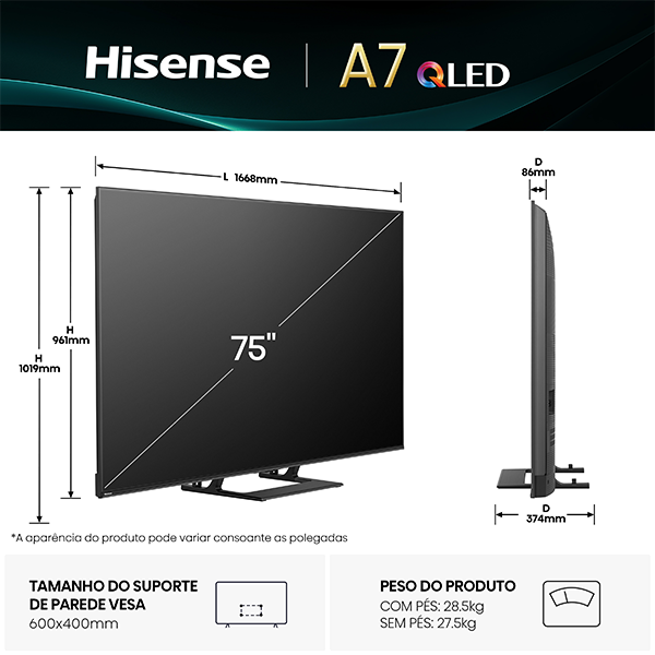 Série A7Q QLED TV 75A7Q Smart TV 75 Polegadas TV com Dolby Vision & Atmos