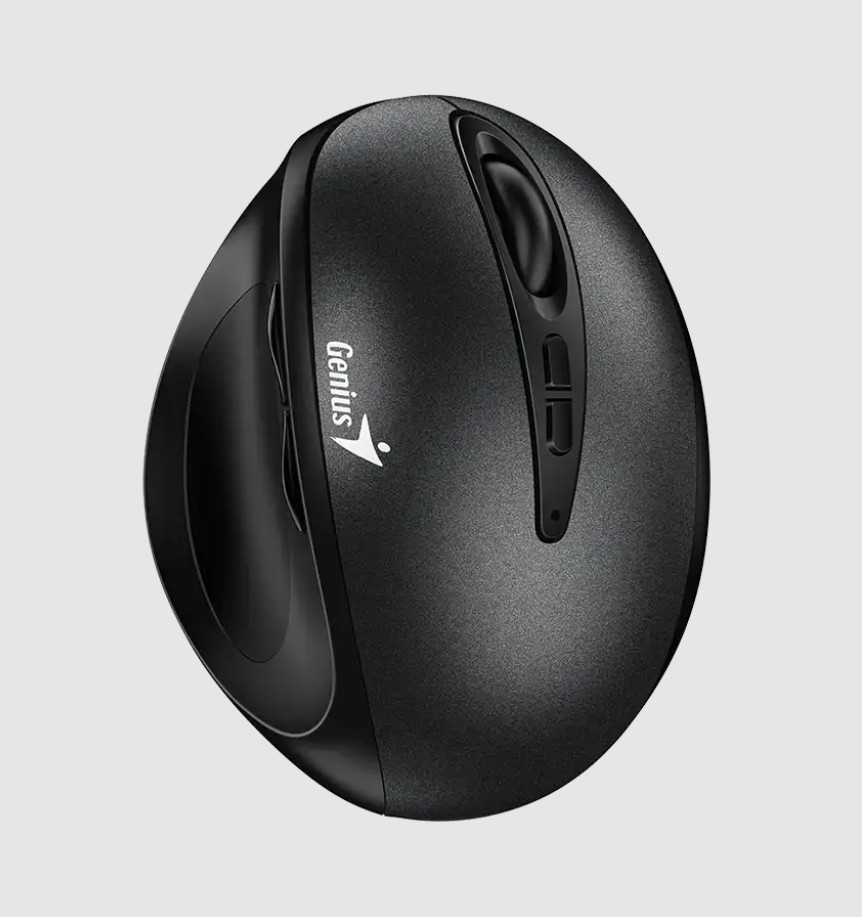 O mouse ergonômico vertical sem fio Genius Ergo 8300S, silencioso, incentiva uma postura mais natural para a mão direita, ajuda a aliviar a fadiga e reduz a tensão muscular na região do antebraço e do ombro.