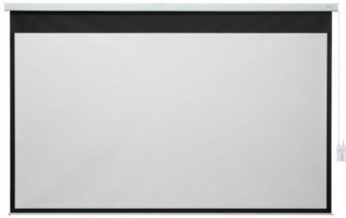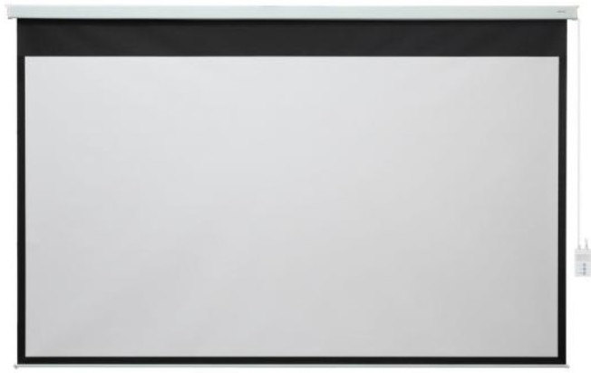 Tela de projeção elétrica com motor síncrono e recolha final ajustável para diferentes tamanhos de ecrã.