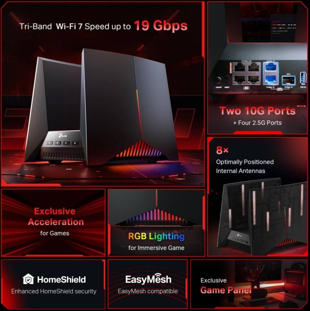 Router TP-Link Archer GE800 Gaming EasyMesh BE7200 Tri-Band Wi-Fi 7 (802.11be) Preto