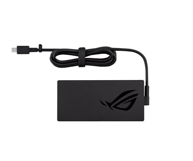 Carregue com o adaptador de tomada compacto ROG de 240 W. Compacto o suficiente para levar a qualquer lugar, ele carrega rapidamente notebooks gamer ASUS e ROG compatíveis com o plugue compacto (retangular).