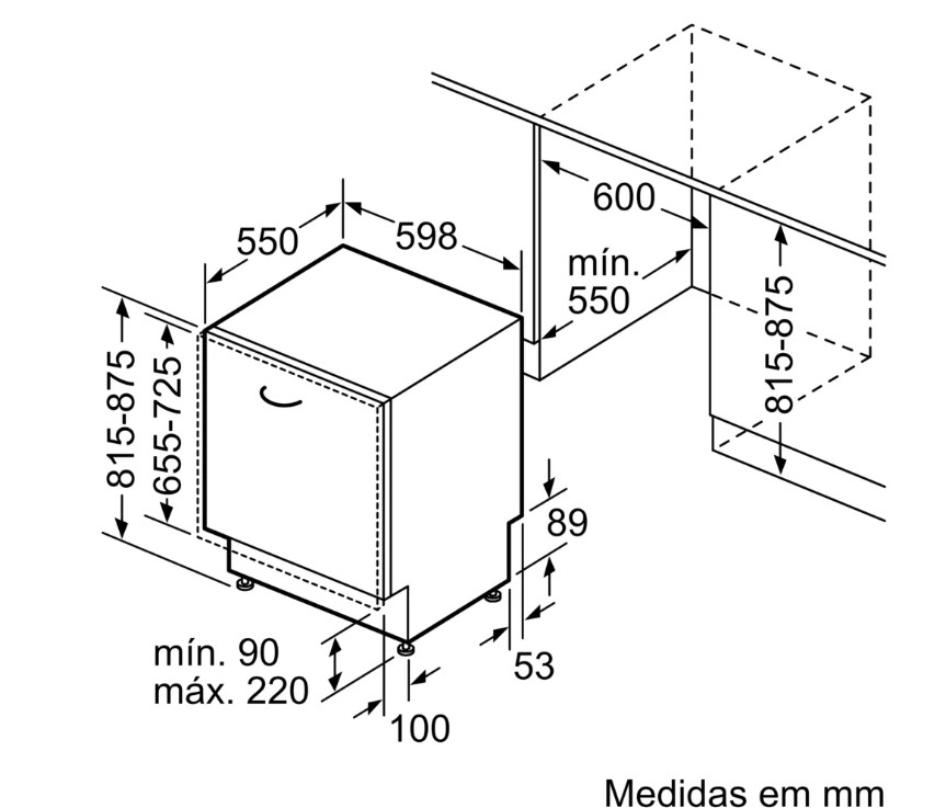BOSCHMáquina Lavar Loiça BOSCH Encastre Série4 SMV4HVX14E conjunto 14 talheres, Classe CMáquina Lavar Loiça BOSCH  Encastre Série4 SMV4HVX14E conjunto 14 talheres, Classe CFabricante/Marca Bosch Peso 33,50 Kg Dimensões 55 x 59,8 x 81,5 cm Tipo de Programas 60min 65°C, Automático 45-65°C, Eco 50°C, Intensive 70°C, Pré-lavagem, Silencioso Arranque Diferido 24 h Consumo de Água 9 Litros Categoria de nível sonoro C Consumo de energia para 100 ciclos - lavagem 75,00 kWh Encastre Sim Consumo Energético 0,75 kWh Nível de Ruído 46,00 dB Capacidade Conjunto Talheres 14 Conjuntos Nº de Programas 6 Escala de Eficiência Energética A a G Dimensões Encastre 60,8x55 cm Tipo de Máquina Lavar Loiça Tamanho do produto: Tamanho completo (60 cm) Visor incorporado: Sim Tipo de controlo: Botões Comprimento do fio: 1,75 m Comprimento da mangueira de saída: 1,65 m Comprimento da mangueira de entrada: 1,9 m Tipo de compartimento de cutelaria: Cesto Temperatura (máx.): 70 °C Tempo de ciclo: 295 min Função aquaStop: Sim Sistema de secagem: Permutador de calor Número de ajustes de temperatura: 4 Temperatura máxima de fornecimento de água quente: 60 °C Temporizador de arranque atrasado: Sim Função aquaSensor: Sim Meia carga: Sim Pés ajustáveis: Sim Ajuste dos pés: 6 cm Topo removível: Não Luz indicadora de chão: Sim Compatível com controlo por smartphone: Sim Aplicações de controlo suportadas: Home Connect Controlado por Wi-Fi: Sim Carga ligada: 2400 W Voltagem de entrada AC: 220 - 240 V Frequência de entrada AC: 50 - 60 Hz Corrente: 10 A Índice de eficiência energética (EEI): 43,9 Índice de eficiência de lavagem (UE 2017/1369): 1,121 Índice de eficiência de secagem (UE 2017/1369): 1,061 Profundidade com porta aberta: 115 cm Altura máxima de compartimento de instalação (mín): 81,5 cm Altura máxima de compartimento de instalação (máx): 87,5 cm Peso do painel personalizado (mín.): 2,5 kg Peso do painel personalizado (máx.): 8,5 kg > lavar loiça - 60cm49590NovoProduto disponível