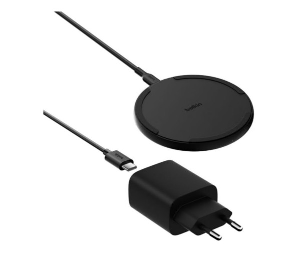 BELKINBase de carregamento sem fios + adaptador de energia AC 15 Watt Belkin BoostCharge WIA012KQBKBase de carregamento sem fios + adaptador de energia AC 15 Watt Belkin BoostCharge WIA012KQBKA base de carregamento sem fios BoostCharge da Belkin oferece uma forma simples de carregar os seus dispositivos sem o incómodo dos fios. Com um cabo USB-C de 1,5 m incluído, pode ligar facilmente o seu telemóvel ou auriculares sem fios para um carregamento rápido. Esta base de carregamento foi concebida com funcionalidades de segurança, como proteção contra sobrecarga e sobretensão, garantindo que os seus dispositivos são carregados com segurança. Um indicador LED mantém-no informado sobre o estado do carregamento, enquanto a deteção de objetos estranhos adiciona uma camada extra de segurança para evitar interrupções. O seu design compacto permite uma fácil colocação em qualquer ambiente, tornando-o um complemento confiável para os seus dispositivos tecnológicos essenciais. Ficha Técnica Descrição do produto Belkin BoostCharge almofada de carregamento sem fios - + adaptador de energia AC - 15 Watt Tipo de produto Almofada de carregamento sem fios + adaptador de energia AC Concebido para Telemóvel, fones sem fios Dimensões (LxPxA) 10.192 cm x 10.192 cm x 1.065 cm Normas de Carregamento sem Fios Qi Potência fornecida 15 Watt Detalhes de Dispositivo de Alimentação Base de carregamento sem fios - USB-C de 24 pinos - 15 W ¦ Adaptador de energia - USB-C de 24 pinos - 20 W Cabos Cabo USB-C - 1.5 m Conteúdo Reciclado de Produto 75 % - fabricado com plástico reciclado pós-consumo > carregadores2890NovoProduto disponível