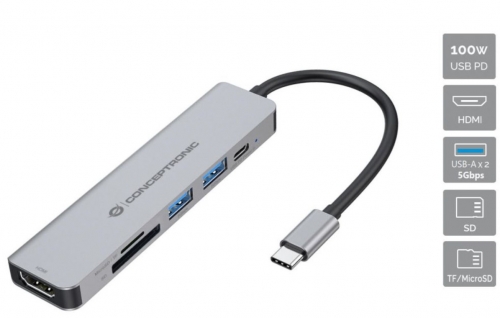 Estação de acoplamento DONN02G 6 em 1 USB-C, HDMI 4K 30Hz, USB-C PD 100W, USB-A 5Gbps x2, Leitor de cartão SD/TF 3.0, Adaptador multiportas USB 3.2 Gen 1