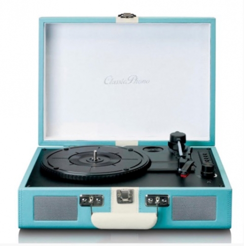 Bluetooth 5.0 • Gira-discos em formato de mala retro • 3 velocidades nominais: 33 RPM, 45 RPM e 75 RPM • Transmissão por correia • 2 altifalantes integrados • Cápsula estéreo em cerâmica com agulha • Armário em MDF com acabamento em pele PU • Ligações: Saída RCA, Saída para auscultadores, Entrada auxiliar • Paragem automática