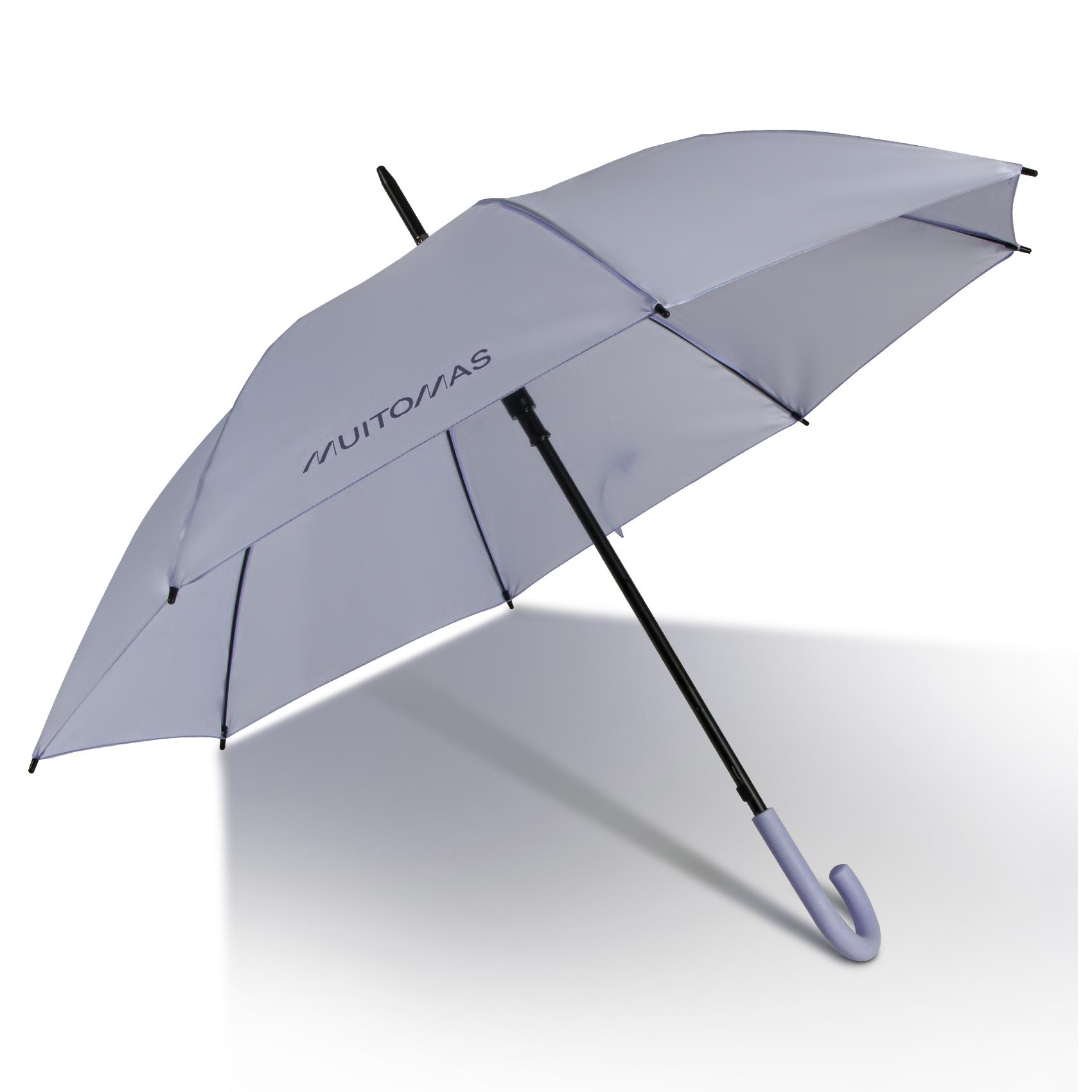 O guarda-chuva Muitomas tem um diâmetro de 23" e um cabo em borracha soft-touch, que proporciona uma pega confortável e antiderrapante.
