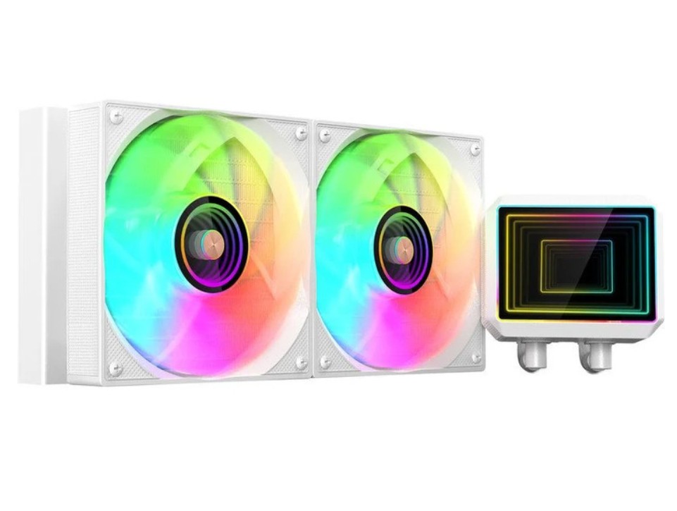 A ML-TWO240W destaca-se pelo seu design visualmente impactante, apresentando um efeito Infinity Mirror tanto no bloco da bomba retangular como no núcleo do ventilador ARGB. Esta abordagem cria um jogo de luz imersivo e totalmente personalizável, permitindo integrar a refrigeração na estética global do seu setup.