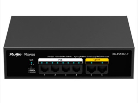Interface: 6 portas RJ45 (2 Uplink + 4 Downlink) Velocidade da porta: 10/100 Mbps Características PoE: 4 portas 802.3af/at PoE+ até 30 W por porta Potência PoE total: 54 W Funções: Isolamento de porta, Watchdog PoE, PoE estendido Gerenciamento: Não gerenciável, mas visível na nuvem Ruijie se houver pelo menos um software gerenciável na instalação Largura de banda: 1,2 Gbps Taxa de encaminhamento de pacotes: 0,89 Mbps Tabela MAC: 2K Tecnologias suportadas: Autonegociação / Modo Auto MDI/MDIX Proteção contra surtos: 4 kV Alimentação: 100~240 VCA 2,0 A Consumo máximo: < 54 W Temperatura de operação: 0 °C 45 °C Dimensões / Peso: 166 x 132,6 x 43 mm Peso 0,96 kg (com embalagem) > redes switch4390NovoProduto disponívelInterface: 6 portas RJ45 (2 Uplink + 4 Downlink) Velocidade da porta: 10 100 Mbps Características PoE: 4 portas 802.3af at PoE+ até 30 W por porta Potência PoE total: 54 W Funções: Isolamento de porta, Watchdog PoE, PoE estendido Gerenciamento: Não gerenciável, mas visível na nuvem Ruijie se houver pelo menos um software gerenciável na instalação Largura de banda: 1,2 Gbps Taxa de encaminhamento de pacotes: 0,89 Mbps Tabela MAC: 2K Tecnologias suportadas: Autonegociação Modo Auto MDI MDIX Proteção contra surtos: 4 kV Alimentação: 100~240 VCA 2,0 A Consumo máximo: < 54 W Temperatura de operação: 0 °C 45 °C Dimensões Peso: 166 x 132,6 x 43 mm Peso 0,96 kg (com embalagem)