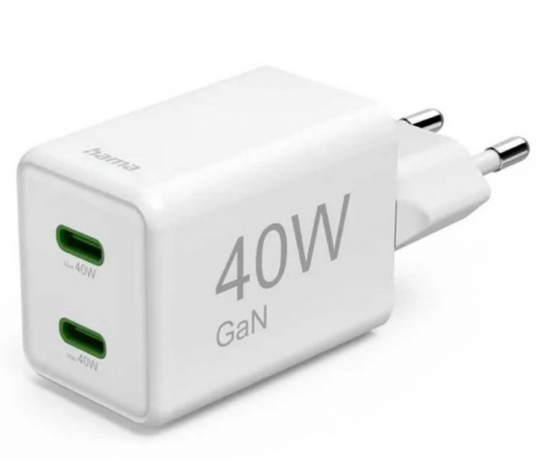 HAMA CARREGADOR RÁPIDO GaN, 2X USB-C, SUPER-MINI, PD, 40 W, BRANCO