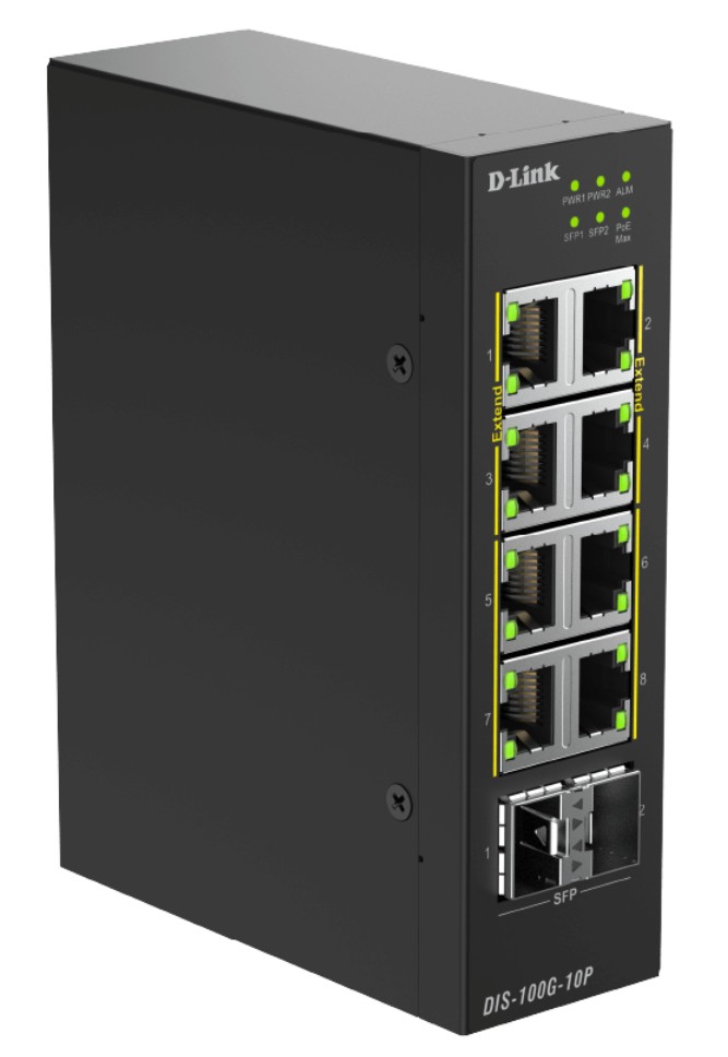 D-linkSwitch 8 Portas D-Link DIS-100G-10PSwitch 8 Portas D-Link DIS-100G-10PSwitch industrial PoE+ não gerenciável de 10 portas Gigabit com 2 portas SFP+ de 2,5G - 8 portas PoE+ 10/100/1000Base-T - 2 portas SFP+ de 2,5G - Capacidade de comutação de 26 Gbps - 802.3af/at, até 30W por porta - Orçamento total de energia PoE: 240W - Jumbo frame de 9K - Até 8K endereços MAC - Sem ventoinha - 802.3az EEE - Ampla faixa de temperatura operacional (-40 a +75°C) - Proteção contra surtos: 6kV - Entrada de alimentação dupla (48~57 VCC) - Trilho DIN - IP30 - Dimensões: 131 x 99 x 40 mm 8 portas GE PoE (30 W) 2 x 2,5G SFP Montagem em trilho DIN > redes switch24890NovoProduto esgotado