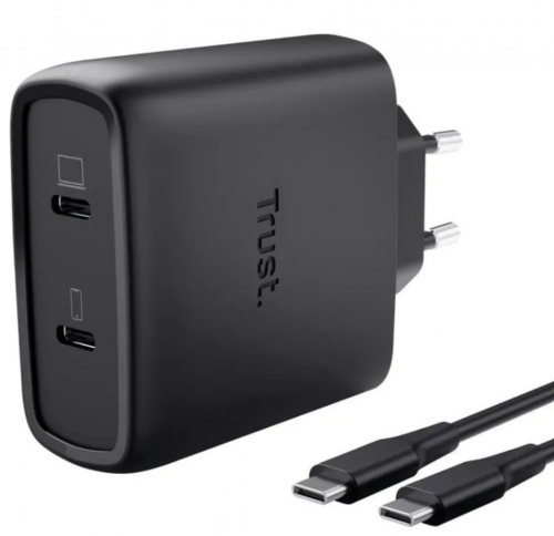Carregador GaN USB-C de 2 portas, rápido e potente, com 65 W, para carregar dois dispositivos simultaneamente.