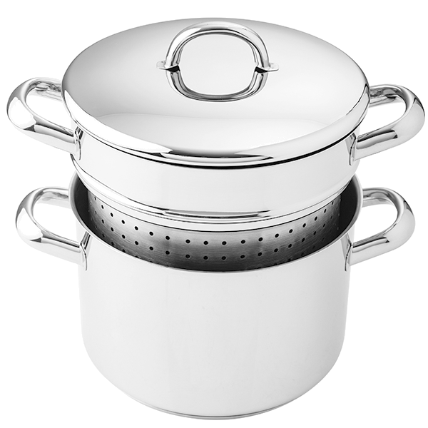 Aço inoxidável (acabamento polido).Inclui espargueteira no interior para cozer e escorrer massas, vegetais e marisco.Composto por: Espargueteira baixa 20, Panela c asas 20, Tampa 20Diâmetro: 20cmAltura: 18cmFunção: Cozer EscorrerFontes de calor: gás, elétrica, elétrica radiante, vitrocerâmica, induçãoTecnologia impact DiscPlus