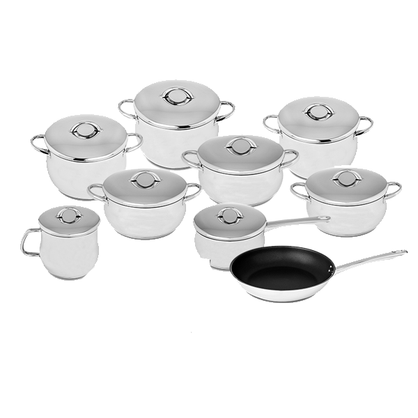 Aço inoxidável (acabamento polido).Composto por:1 Caçarola com asas 16: 1,6lts1 Caçarola com asas 20: 2,8lts1 Caçarola com asas: 24: 4,4lts1 Caçarola com cabo 16: 1,6lts1 Cafeteira com asa 14: 2lts1 Frigideira cónica anti aderente 24: 1,7lts1 Panela com asas 16: 2,3lts1 Panela com asas 20: 4,1lts1 Panela com asas 24: 6,4lts1 Tampa 143 Tampas 162 Tampas 202 Tampas 24Fontes de calor: Gás, Elétrica, Eléctrica radiante, Vitrocerâmica, InduçãoTecnologia ImpactDiscPlus