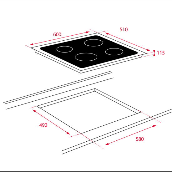 Largura do produto: 600 mm, Profundidade da Unidade: 510 mm, Altura da Unidade: 100 mm