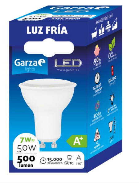 Casquilho: GU10 Potência: 7 WClasse Energética: A+ Duração: 15000 HorasTemperatura: 6500 k- > lampadas390NovoProduto disponívelCasquilho: GU10