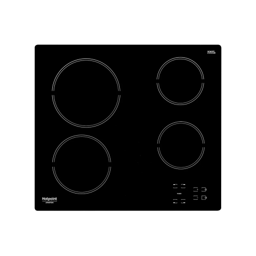 A placa de cozinha Hotpoint-Ariston HR 632 B apresenta mesa de trabalho vitrocerâmica de cor preta e perfil biselado, que conta com quatro zonas de aquecimento de dimensões e potências distintas, somando potência máxima total de 6200 W.