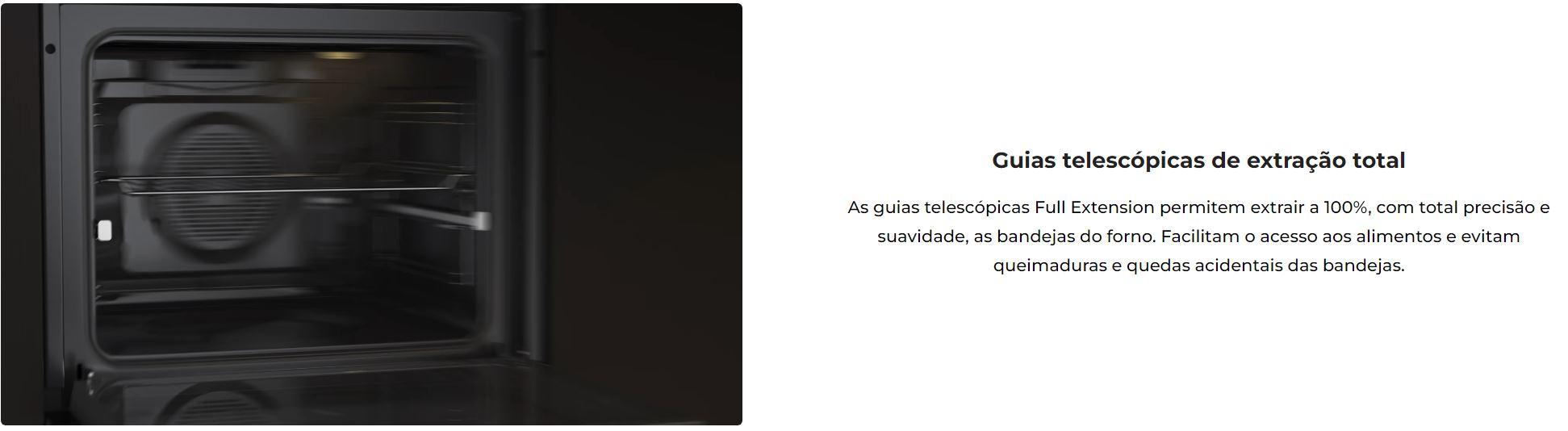 As guias telescópicas Full Extension permitem extrair a 100%, com total precisão e suavidade, as bandejas do forno.