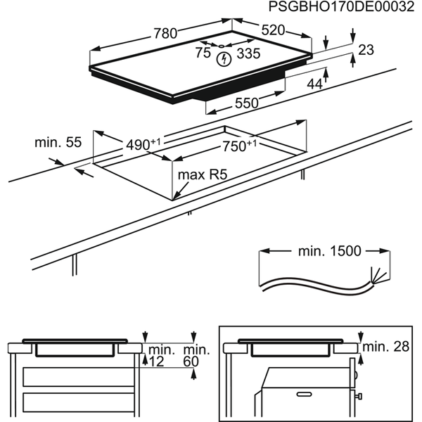 Placa de indução de 78 cm SensePro com sonda térmica, com 4 zonas power, função Hob2Hood, função FlexiPonte, PowerSlide, ecrã tátil único, Temporizador, Instalação EasyFix, biselada, com bloqueio de funções.