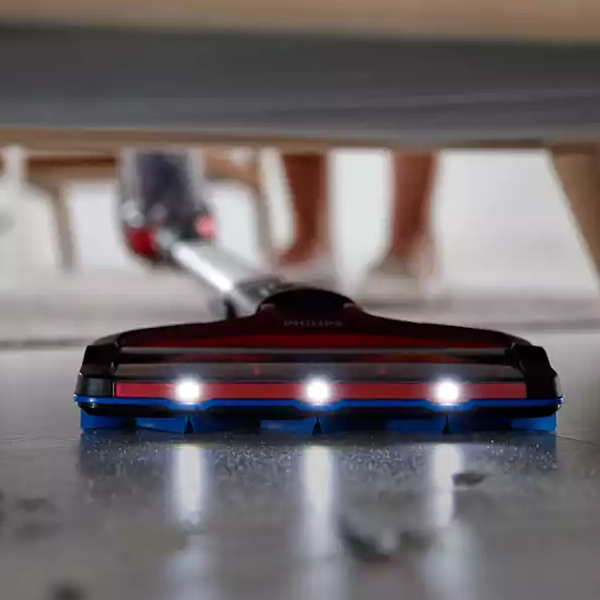 O revolucionário SpeedPro Max com escova de sucção de 360° recolhe mais sujidade em cada passagem, para a frente e para trás, mesmo junto às paredes e mobiliário.