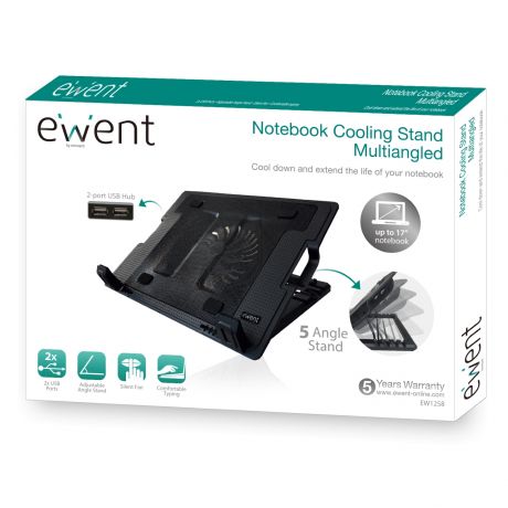O estante multi-ângulo de Esfriamento para Laptop Cooling EWENT EW1258 tem uma superfície de malha de metal com um poderoso mais silencioso ventilador 12,5 centímetros para impedir que dispositivos de superaquecimento. Este etsante versátil pode ser usado como meios de comunicação portáteis ou de uma almofada de arrefecimento. O EW1258 é alimentado por USB para que você não precisa de uma fonte de alimentação externa. O EW1258 pode ser ajustado para 5 diferentes ângulos de visão para criar a altura ideal de trabalho. Além disso, o EW1258 acrescenta 2 extra para as portas USB do laptop. Os pés de borracha antiderrapantes manter o EW1258 no lugar.