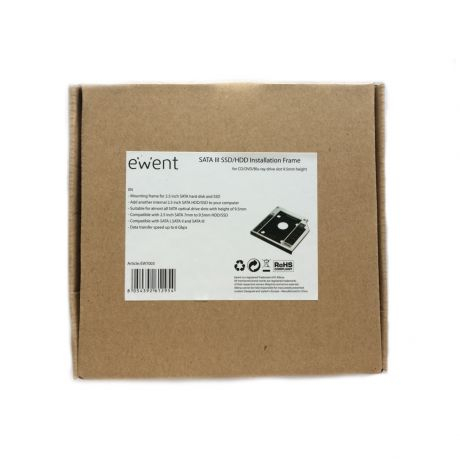 O quadro corresponde a uma altura de 9,5 mm e foi projetado para SSDs e HDDs SATA de 2,5 polegadas. A estrutura de montagem Ewent EW7003 SSD HDD para o slot da unidade de CD DVD Blu-ray é usada em quase todas as baias de unidade óptica com interface SATA. Ele fornece a expansão de memória através do uso de um disco rígido SSD e permite um acesso mais rápido aos dados que ele contém.