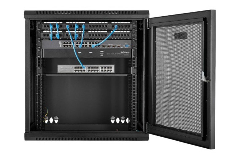 A prateleira de rede 12U possui uma porta frontal amovível e reversível e painéis laterais amovíveis, cada um com mecanismos de remoção rápida, de forma a poder aceder facilmente ao seu equipamento. Além disso, cada porta e painel neste armário rack possui um bloqueio independente, garantindo que o seu equipamento fica protegido.