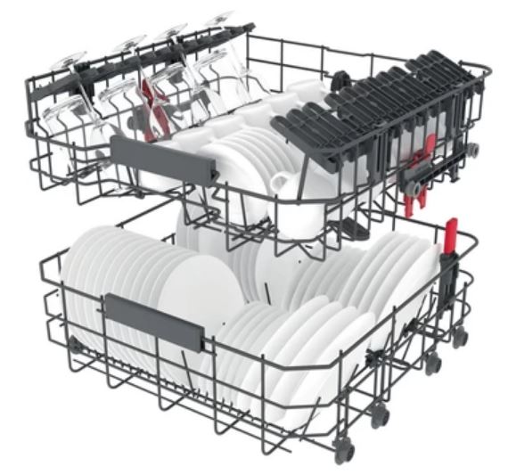 O exclusivo design ExtraSpace permite carregar panelas e frigideiras na vertical, no cesto inferior, proporcionando-lhe espaço para mais 10 pratos.