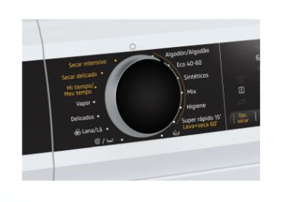 Rápido 15 min, Higiene de temperatura baixa, roupa misturada, escoar centrifugação, Enxaguamento simples, Fácil engomar, Automático antinódoas, Pré-lavagem, Refrescar, Secagem intensiva, Secagem cuidadosa, Lavar & Secar 60