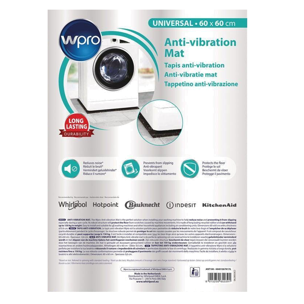 O tapete antivibração Wpro é a solução perfeita para instalar a sua máquina de lavar roupa, reduzindo o ruído e prevenindo de deslizar, especialmente durante o ciclo de centrifugação