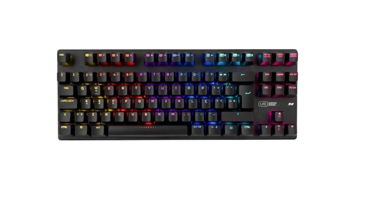 Teclado gaming mecânico TKL com iluminação RGB Rainbow e funções de atalho.