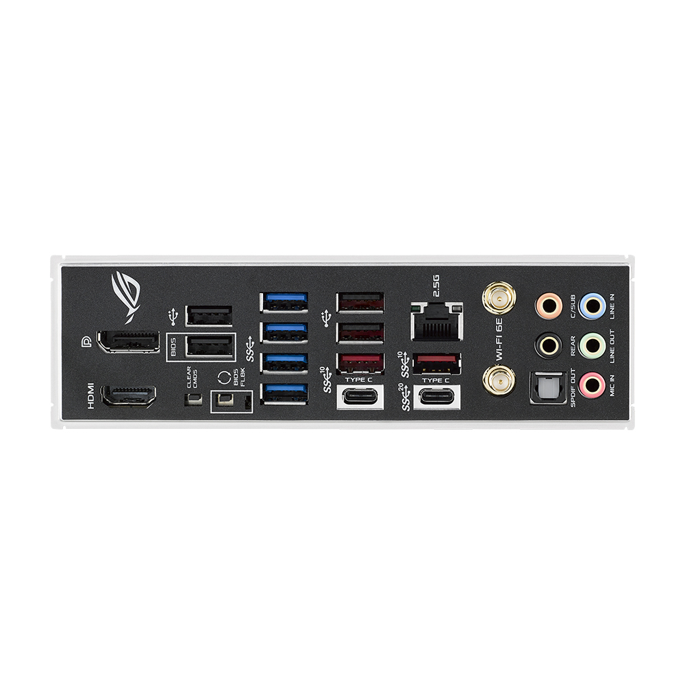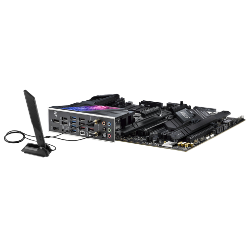 Um visor acrílico especialmente iluminado na tampa de I/O dá a ilusão de que a placa de circuito é visível por baixo de um logótipo RGB ROG.
